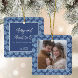 Minimal Blue Border Photo Elegant Christmas Ceramic Ornament